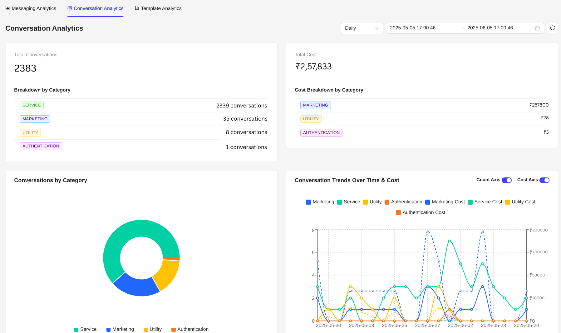 Track message delivery, conversation costs, template performance, and customer engagement in real-time.