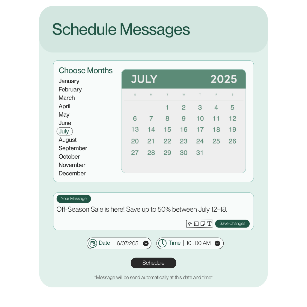 Schedule individual messages to be sent at specific dates and times. Perfect for announcements, reminders, and special occasions.